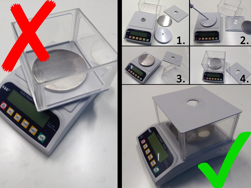 Insbesondere bei den Waagen, die mit einem Windschutz geliefert werden: Prüfen, ob der Windschutz korrekt aufgebaut wurde. Es passiert häufig, das der Deckel vom Windschutz unterhalb der Wägefläche eingebaut wird: