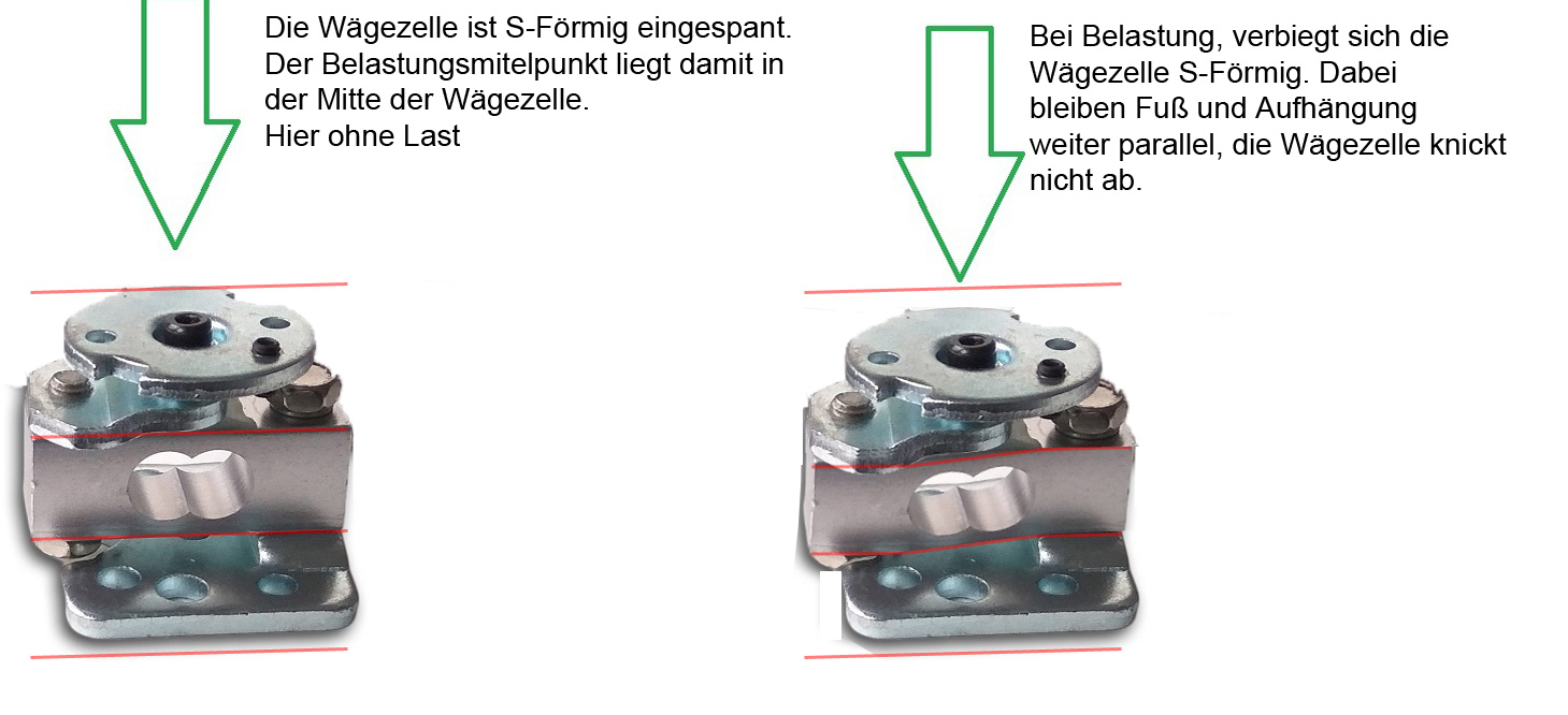 Bei einer Verformung drückt sich die Wägezelle S-Förmig durch und es entstehen vier Knickstellen. An allen 4 Knickstellen sind, sowohl oben wie auch unten, mehrere DMS-Sensoren angebracht. Damit kann die Kraft mit der eine Wägezelle zusammen gedrückt wird deutlich genauer ermittelt werden als bei einem einfachen Biegebalken. Der "Doppelbiegebalken" ist übrigens die Technik, mit der alle G&G-Plattformwaagen arbeiten. Von der knapp 60 € teuren PSB bis zur 600 € teuren TC.