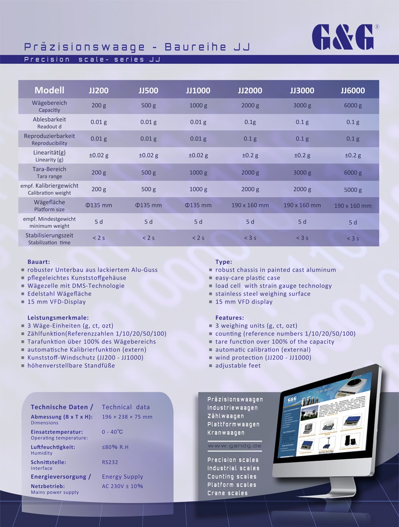 - Hochpräzise Messungen: Die JJ-Präzisionswaagen bieten eine außergewöhnliche Genauigkeit und sind für verschiedene Wägebereiche geeignet, siehe Modellauswahl.